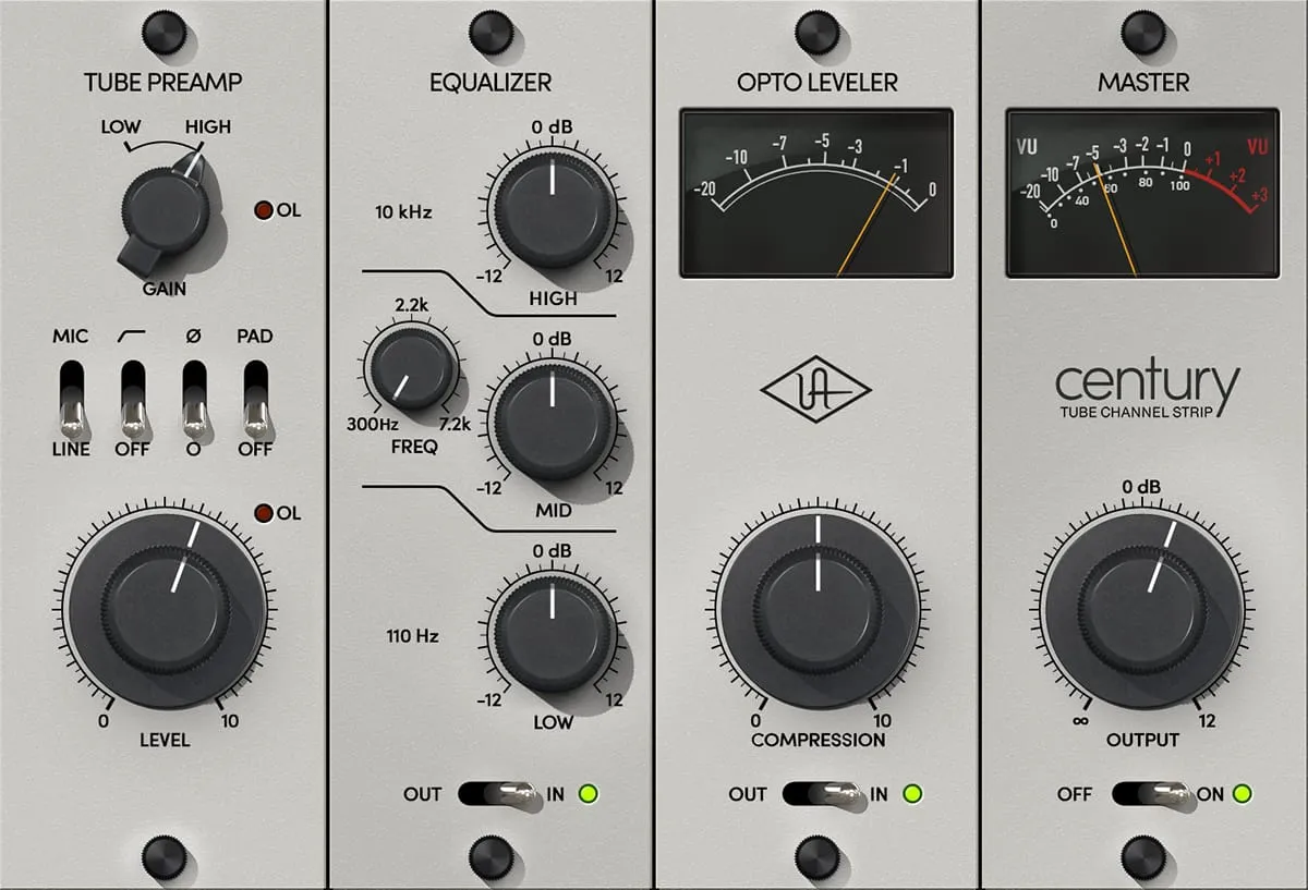 Century Tube Channel Stripは、直感的で音楽的な音色を持つ3バンドEQで、ブレスの長いボーカルのディテールを素早く引き出したり、オーバードライブしたエレキギターにパンチを加えたり、アコースティックリズムギターに推進力のあるシズル感や輝きを与えるのに最適です。