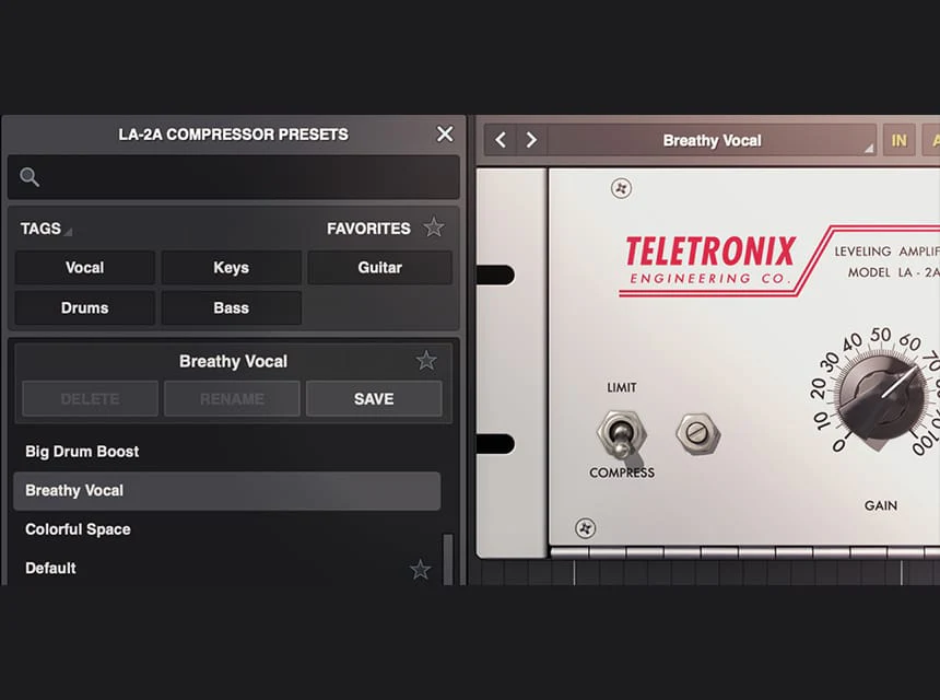 ミックスのプロでなくても、LA-2A Tube Compressorなら直感的なコントロールで理想のサウンドをすぐに得られます。ボーカル、ギター、ベースなどに最適化されたプロ仕様のプリセットを使えば、過去50年以上のヒットソングで聴かれてきた、あの穏やかで心地よいチューブ・コンプレッションをあなたの作品にも簡単に加えることができます。